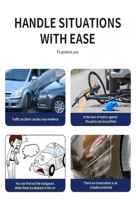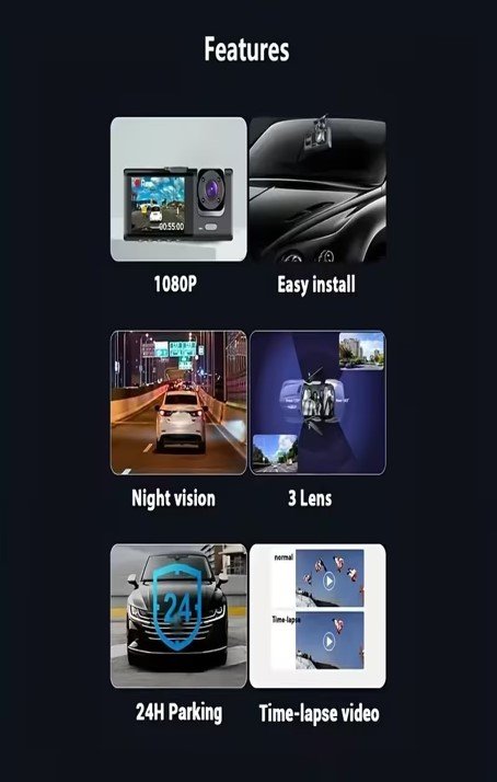 Sistema de Grabación para Coche con 3 Cámaras:Frontal Full HD 1080P + Trasera/Interna 720P, Grabación en Bucle, Visión Nocturna Mejorada, Monitor de Estacionamiento, Compatible con Tarjeta TF 128GB, Alimentación 12V y Operación por Botón